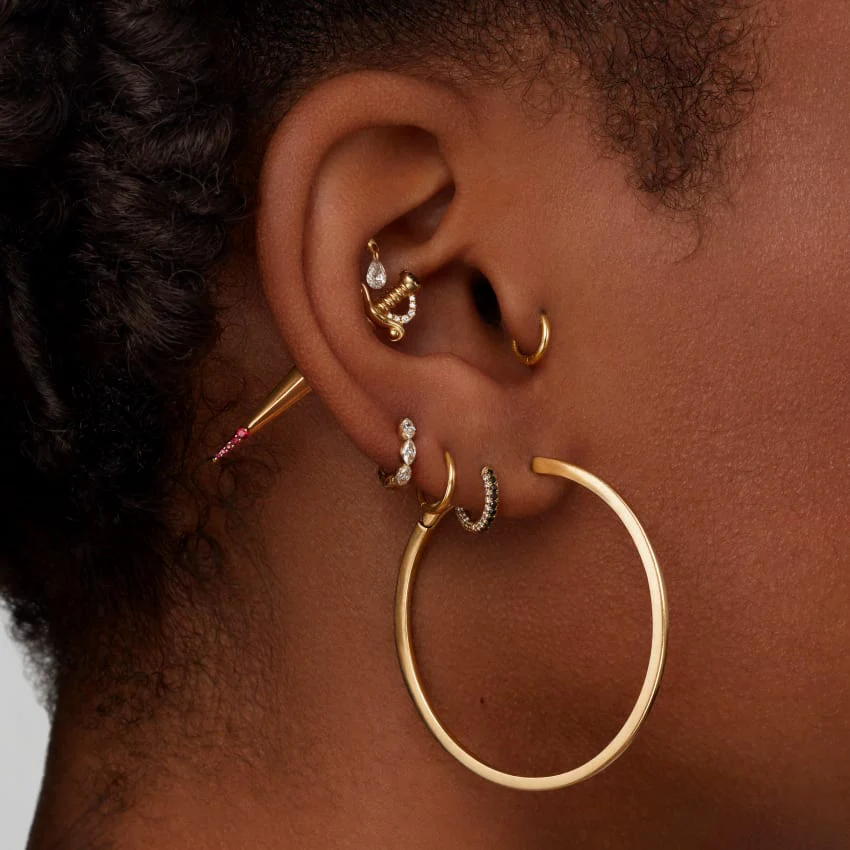 This large solid gold, sword shaped design gives the appearance of piercing straight through the ear. The frontal of this stud is an intricately detailed hilt with a swirled crossguard, a scalloped set black diamond at the tip of the pommel, and a handguard inset with pavé diamonds on both sides. The blade shaped backing features ruby droplets on both sides of the central ridge and extends straight out from the back of the ear long enough to be visible from the front.