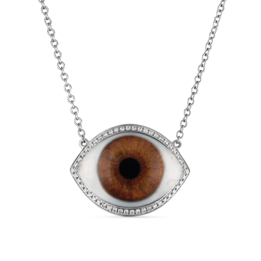Each TASH Eye necklace features a glass eye handmade by a master glassblower. Every piece is crafted with a realistically colored iris and delicate red capillaries surrounded by a halo of ideal cut round diamonds attached to an elegant solid gold chain.