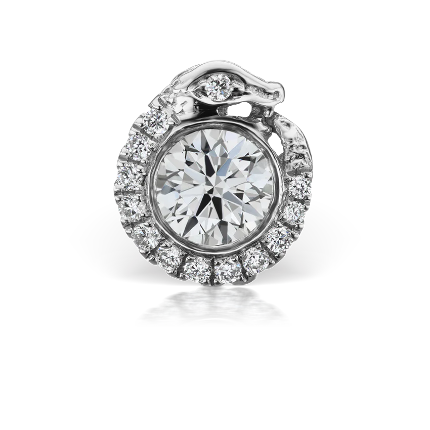 This mesmerizing solid gold stud, inspired by the mythical Ouroboros, is in the shape of a snake eating its own tail as it wraps around a large diamond. The snake's body and eyes are embellished with pavé diamonds.