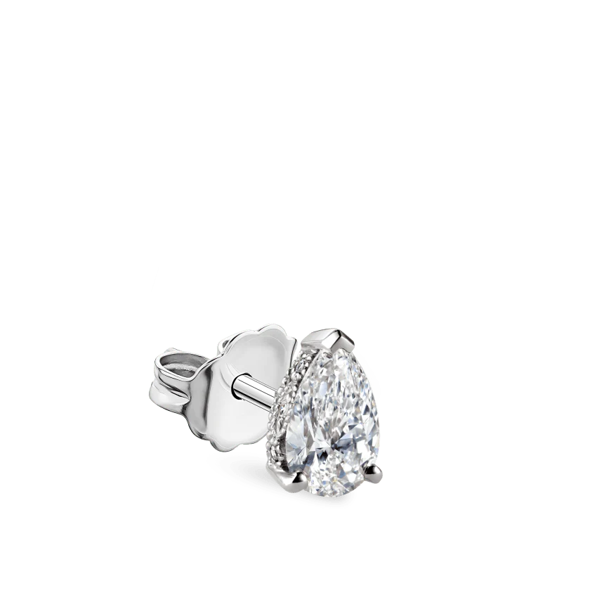 A large diamond stud in a teardrop or pear shape. The intricate solid gold scalloped bezel adds an extra level of scintillation along the side. The brilliance of the diamond provides an impressive flash in a low profile setting.