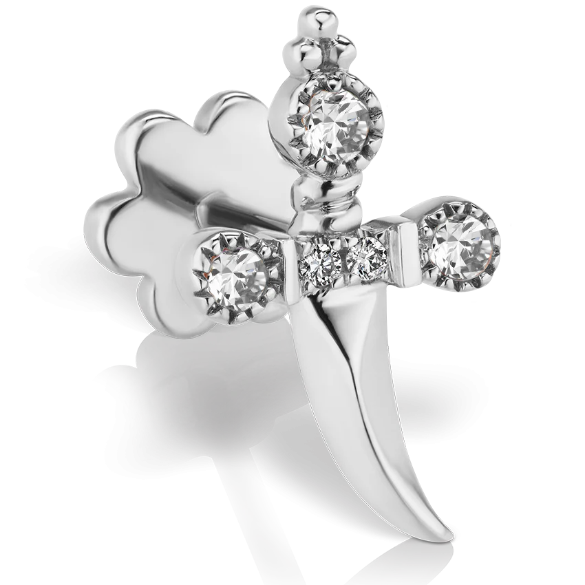 This sleek, solid gold dagger features an intricately adorned hilt, complete with diamond accents, exquisite gold detailing, and a ball trinity design on the pommel. Available in a right-curving or left-curving shape to complement the contour of either ear.