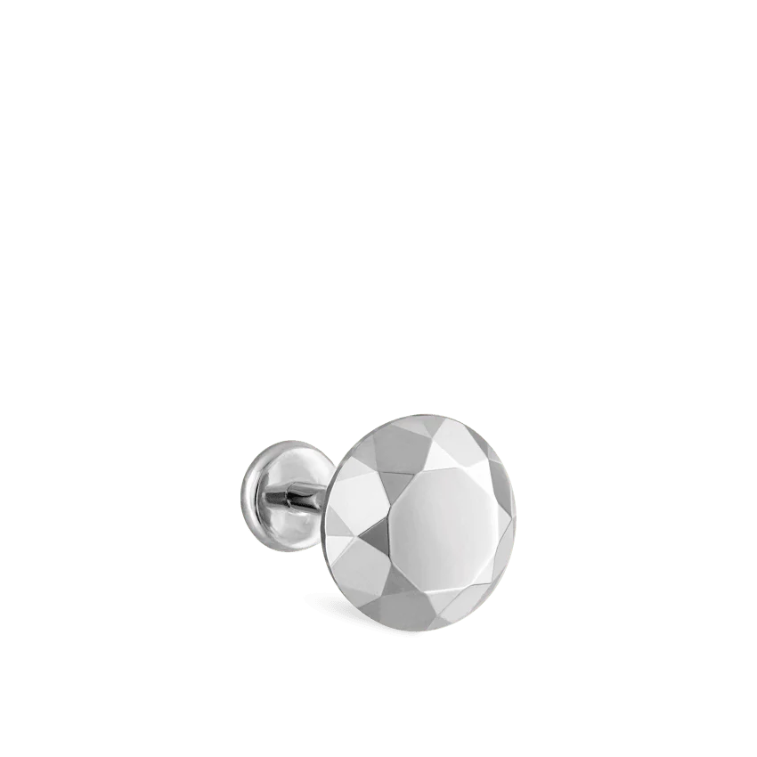 A solid gold stud meticulously engineered with the faceting of a brilliant round cut diamond. This 3D style captures the essence of its diamond counterpart, offering a modern alternative that allows for beautiful light reflection from all angles.