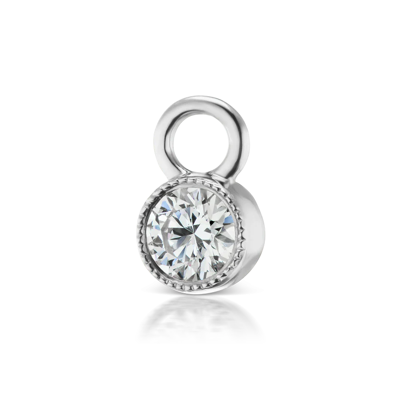Our round cut diamond charm brings out the stone's brilliance, dispersion, and scintillation. This charm has a solid gold scalloped setting which adds texture and elegance.